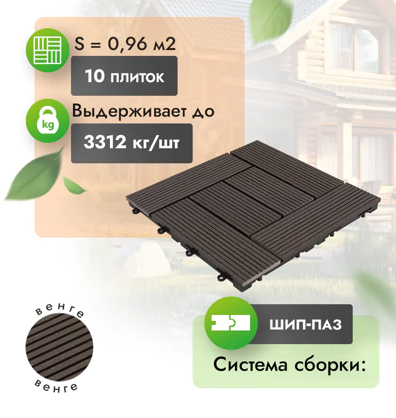 Садовый паркет из ДПК – превосходное решение для создания элегантных и практичных покрытий на вашем участке. С помощью паркета садового вы сможете создать уютные и стильные дорожки, площадки и отдельные зоны, которые будут долговечными и привлекательными. Материал является хорошей альтернативой тротуарным плиткам и модульному паркету.